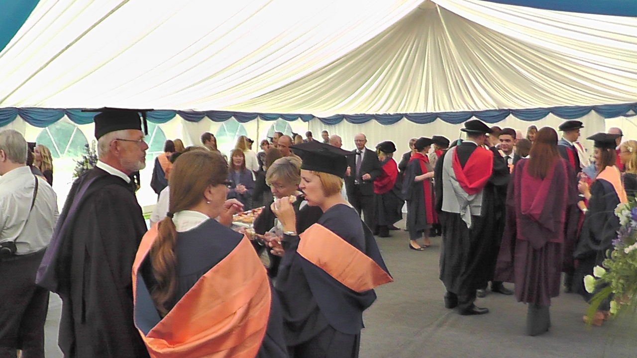 その後パーティーです。真ん中のオレンジのガウンはBA、その手前のオレンジが広いガウンを着ている人はMAです。