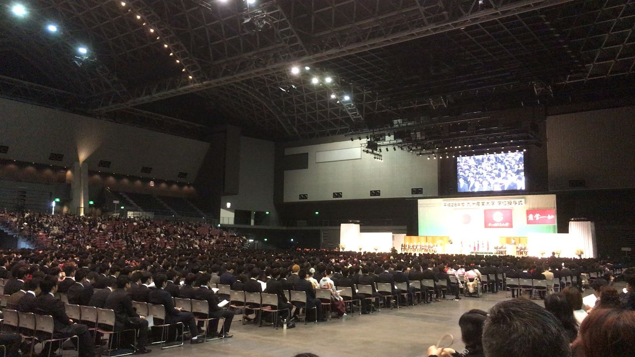 卒業式はマリンメッセ福岡。全学部一緒の卒業式です。